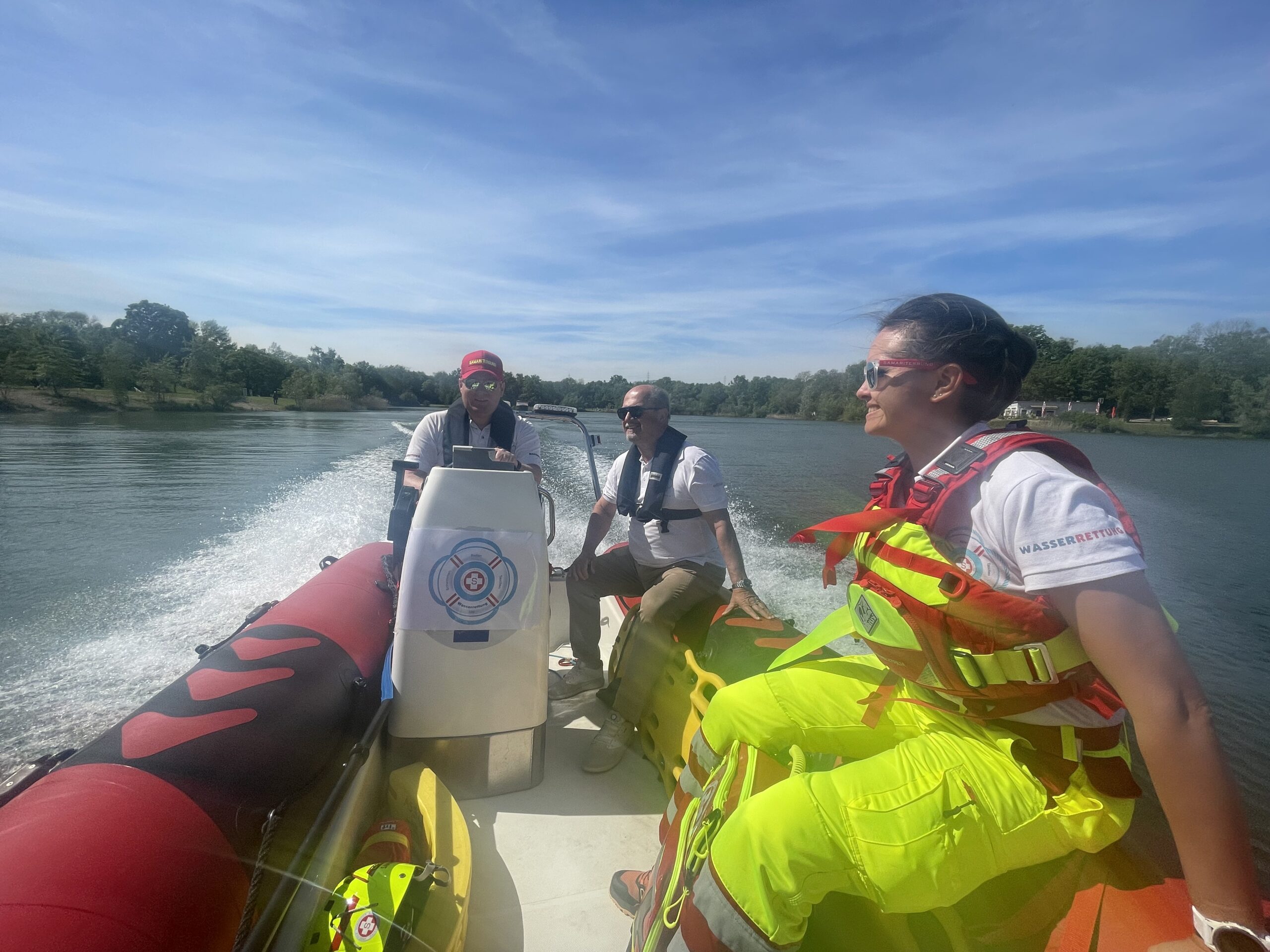Landespräsident Günther Erhartmaier ließ es sich nicht nehmen und besuchte unsere Wasserretter bei Traumwetter an ihrem ersten Tag. Bei einer Fahrt mit dem Rettungsboot erlebte er hautnah, wie professionell die Samariter für die Sicherheit der Gewässer sorgen. Dafür trainieren unsere Kolleg:innen außerhalb der Badezeit auch regelmäßig, damit jeder Handgriff im Ernstfall sitzt.